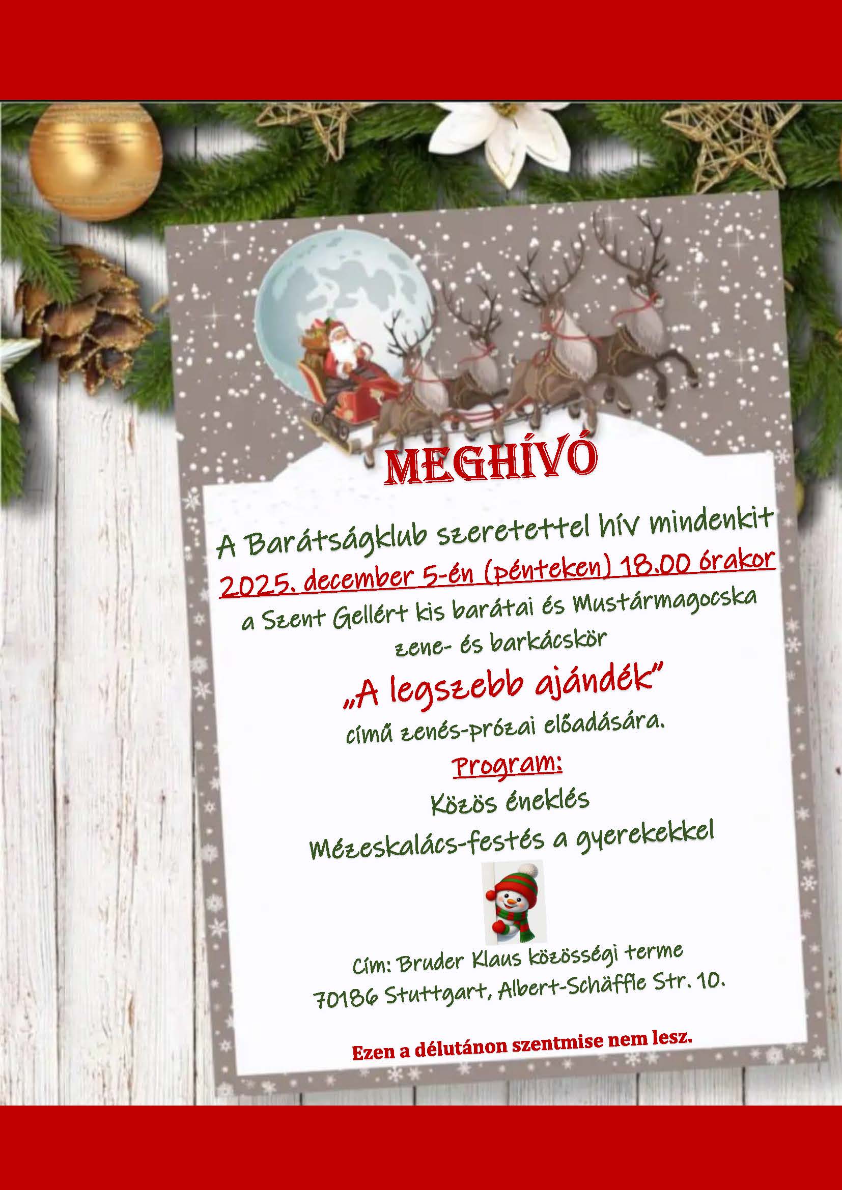Schwäbisch-Gmündben 9.30 órakor szentmise, keretében a 2. adventi gyertya meggyújtása, megemlékezés Szent Miklós püspökről, utána agapé.