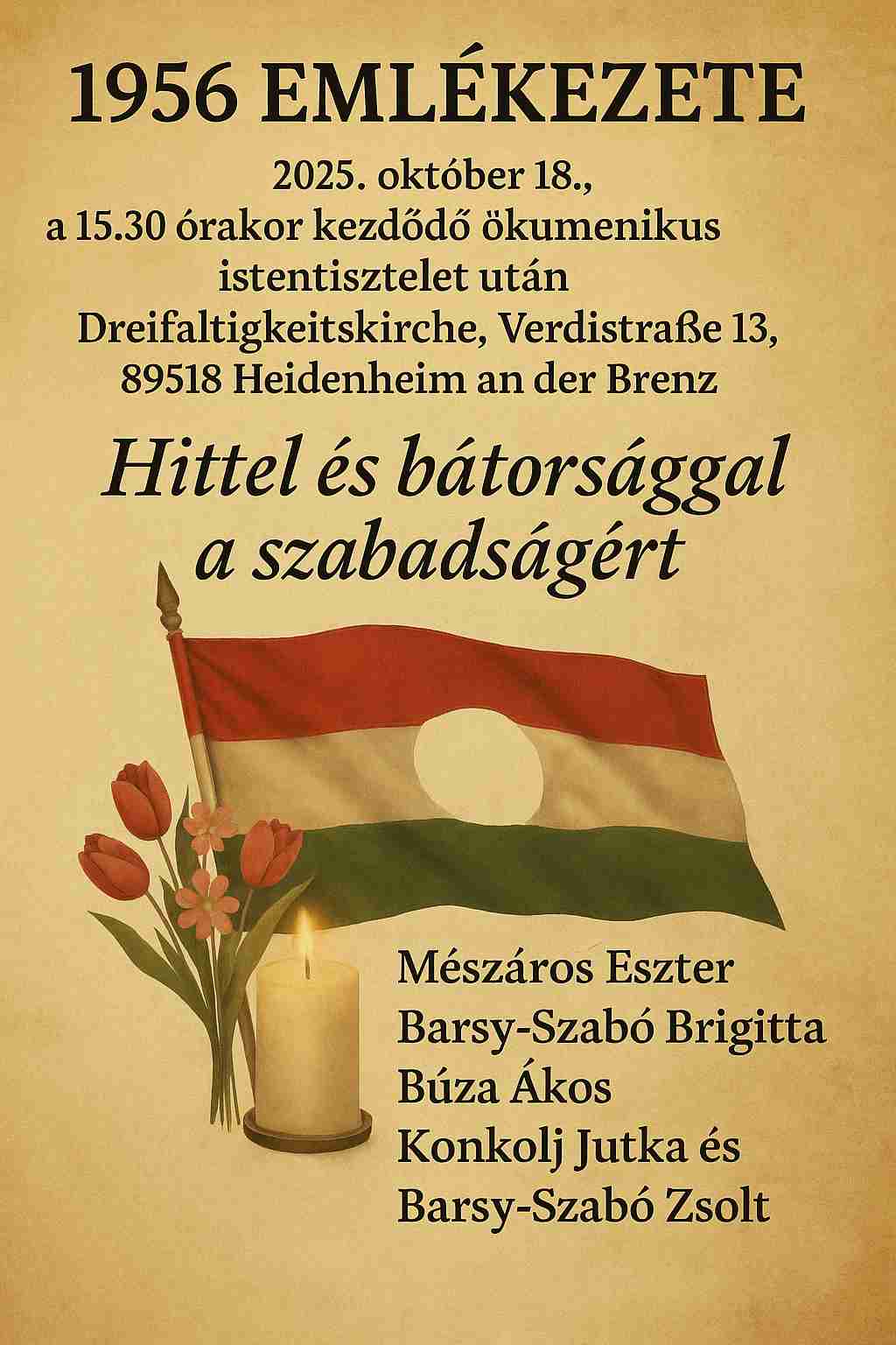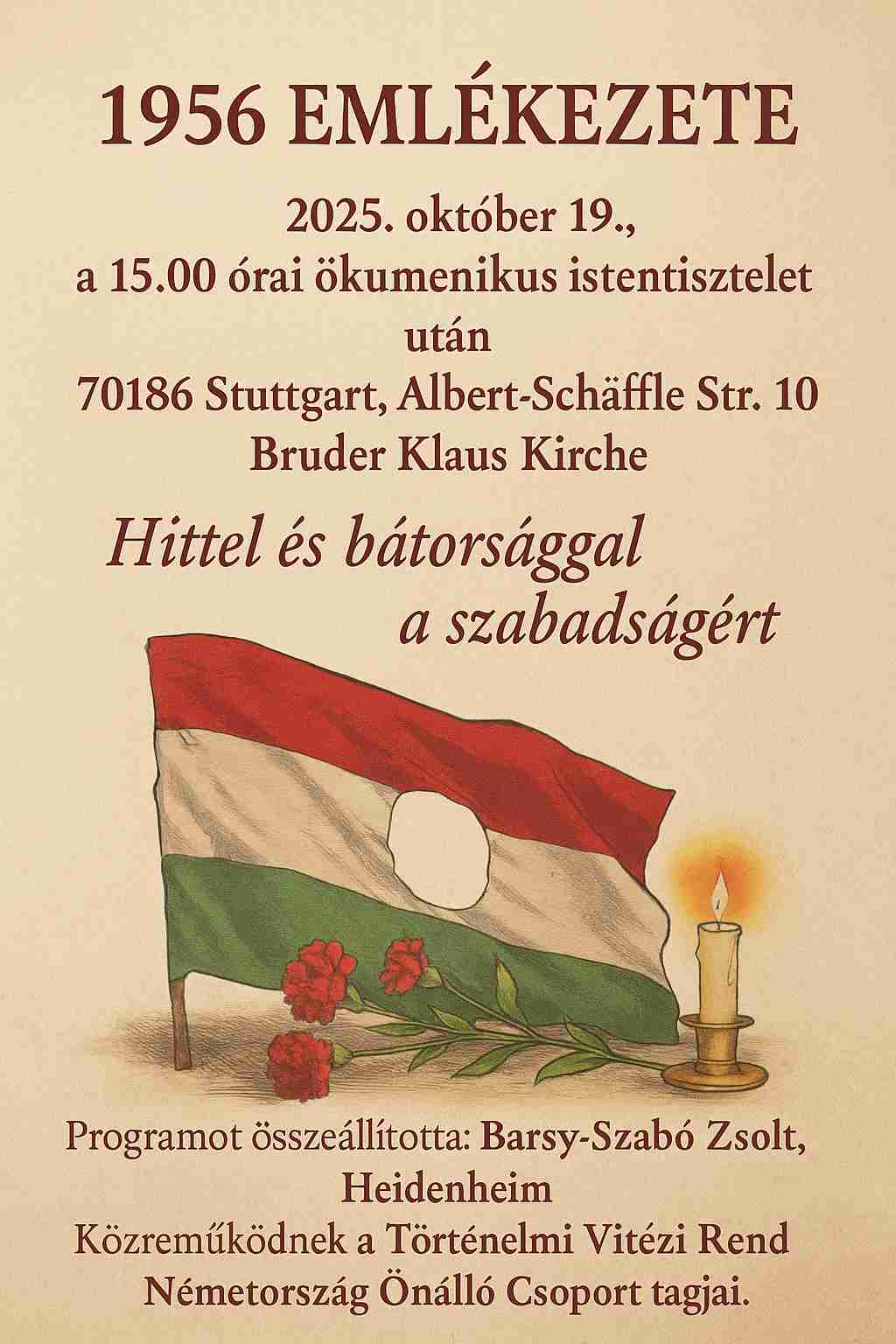 16.00 órakor ünnepi megemlékezés 1956. október 23-ról, végül állófogadás a közösségi teremben. Közreműködnek a Történelmi Vitézi Rend Németország Önálló Csoport tagjai.